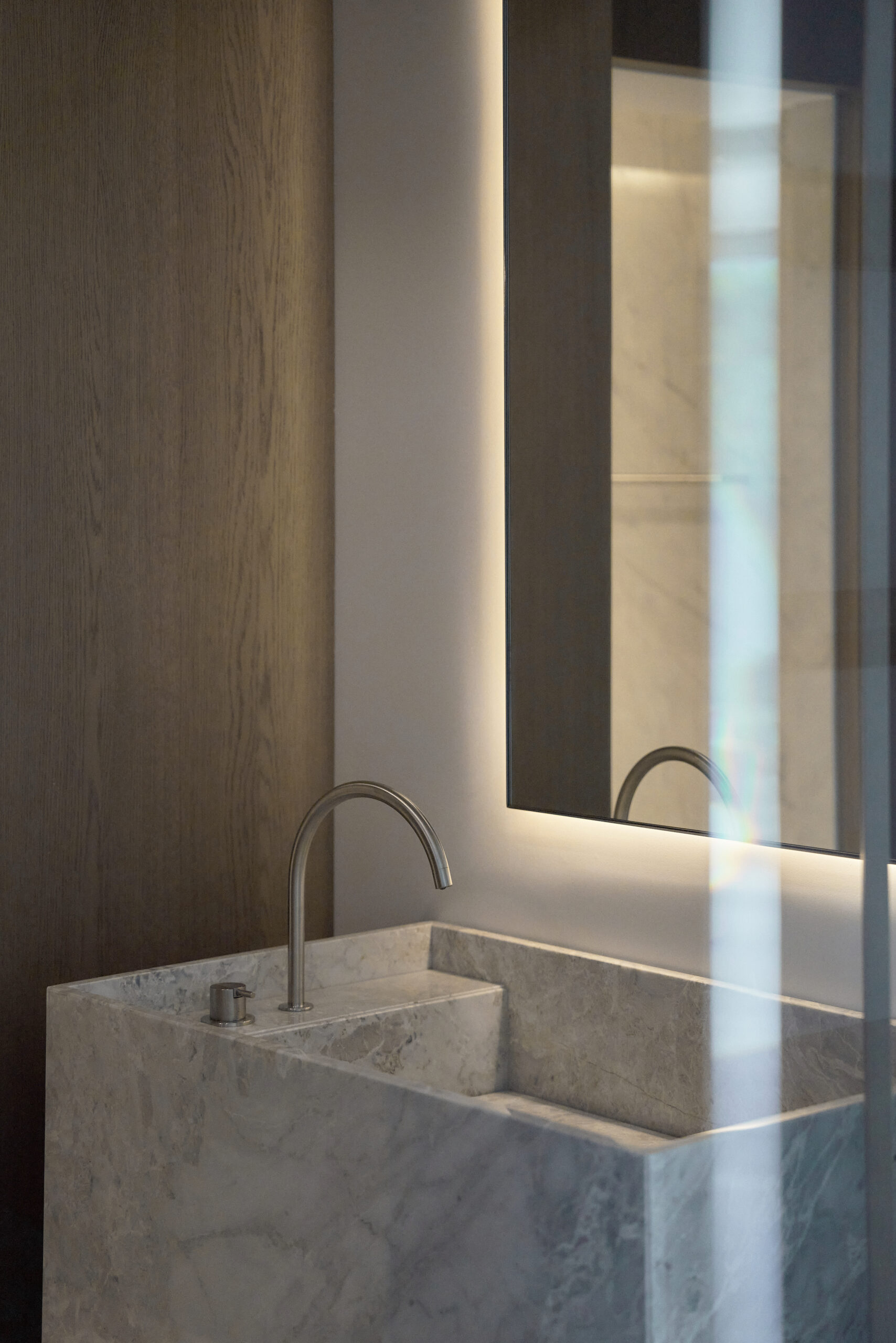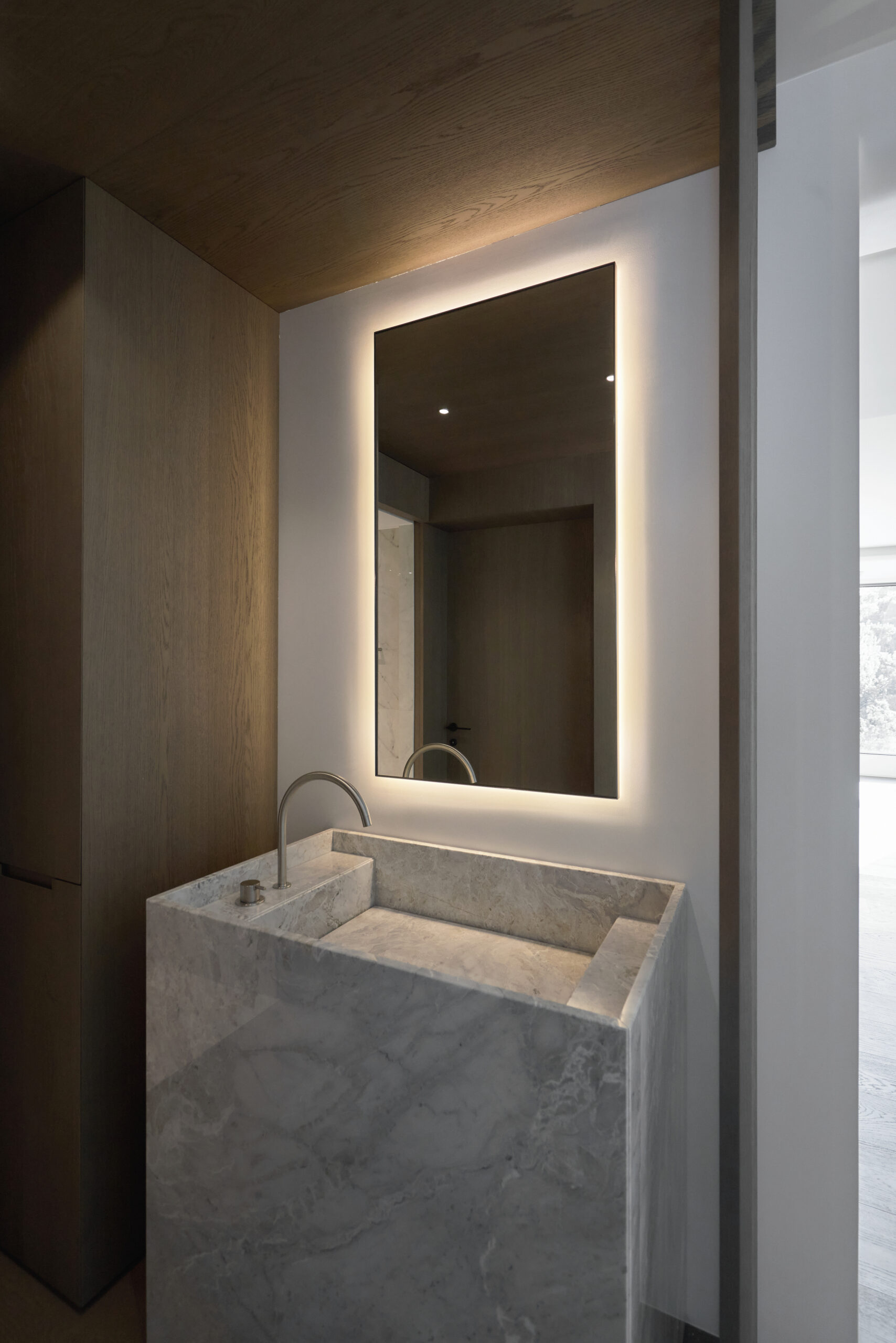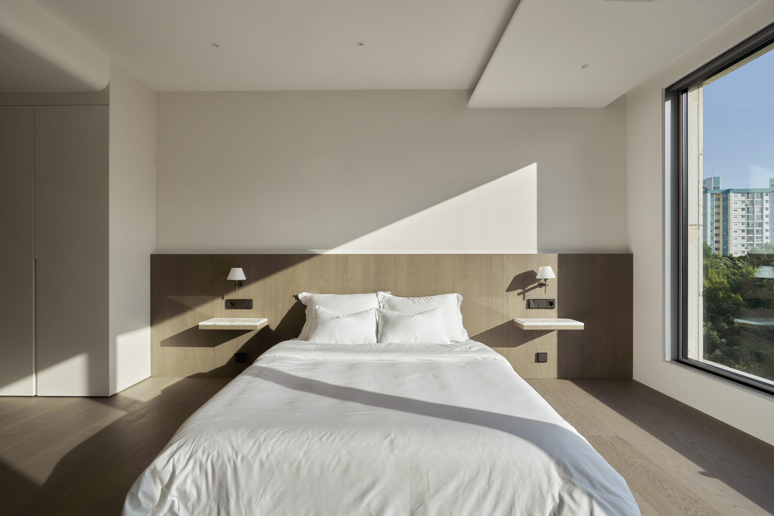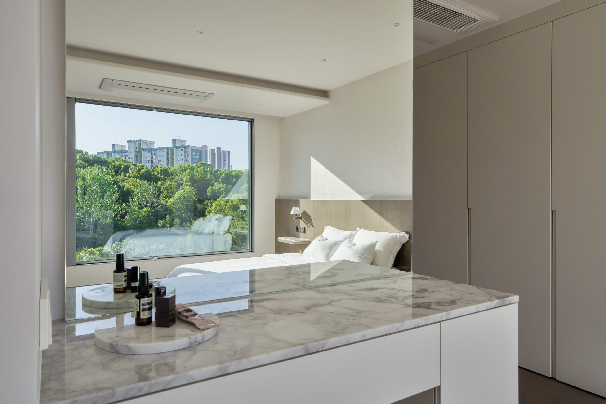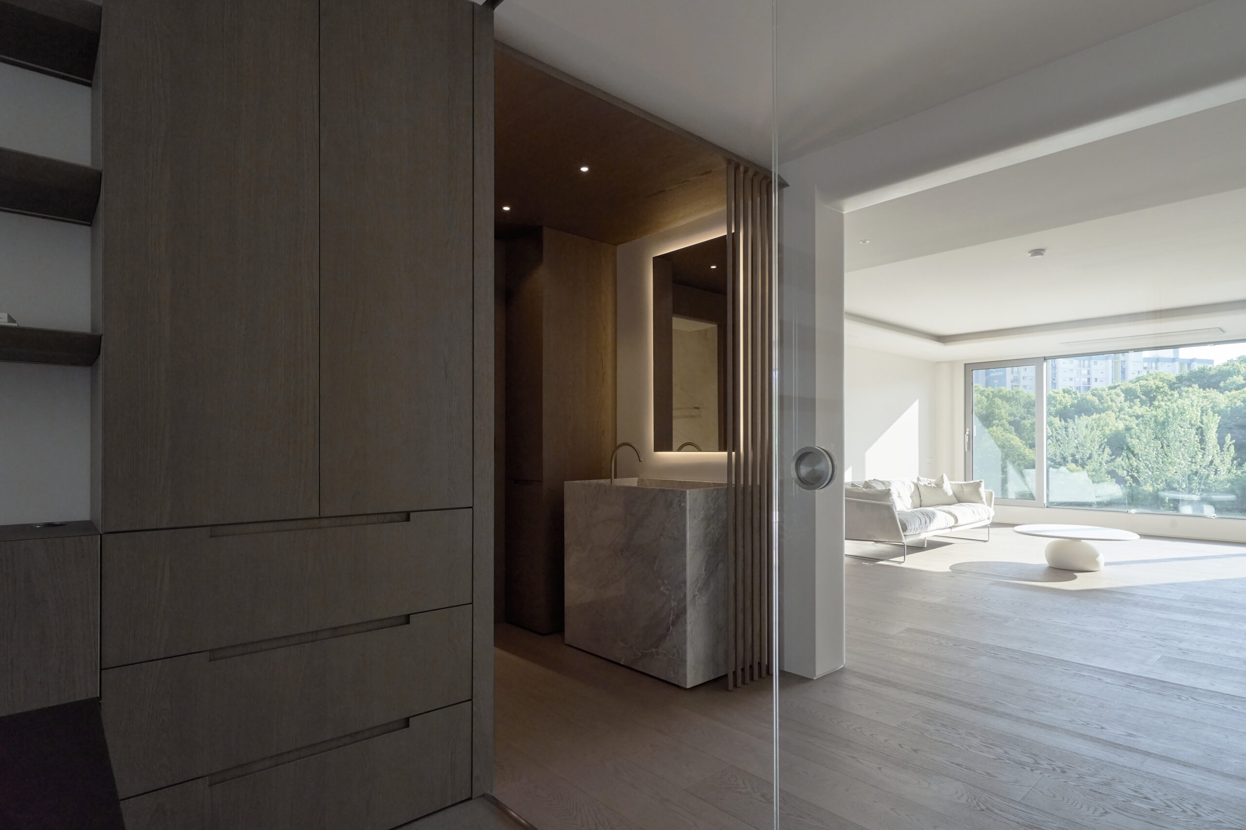 특히 거실과 안방에서 펼처지는 숲뷰와 조화를 이루기 위해 내부에도 무늬목과 원석 같은 천연 소재를 사용했습니다. 고유한 색감이 지닌 깊이를 그대로 살려 소재 자체의 아름다움이 공간 안에서 자연스럽게 존재감을 드러내도록 했습니다.