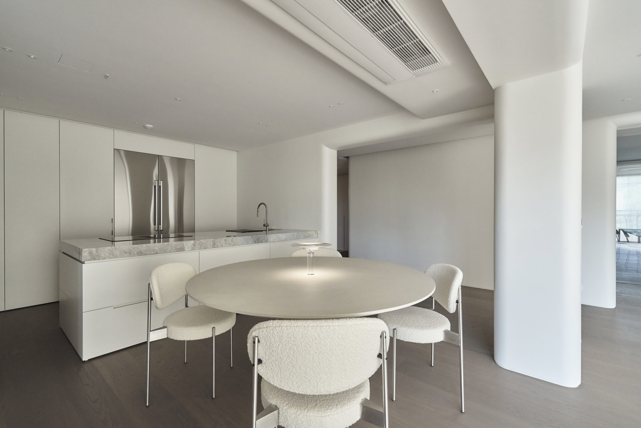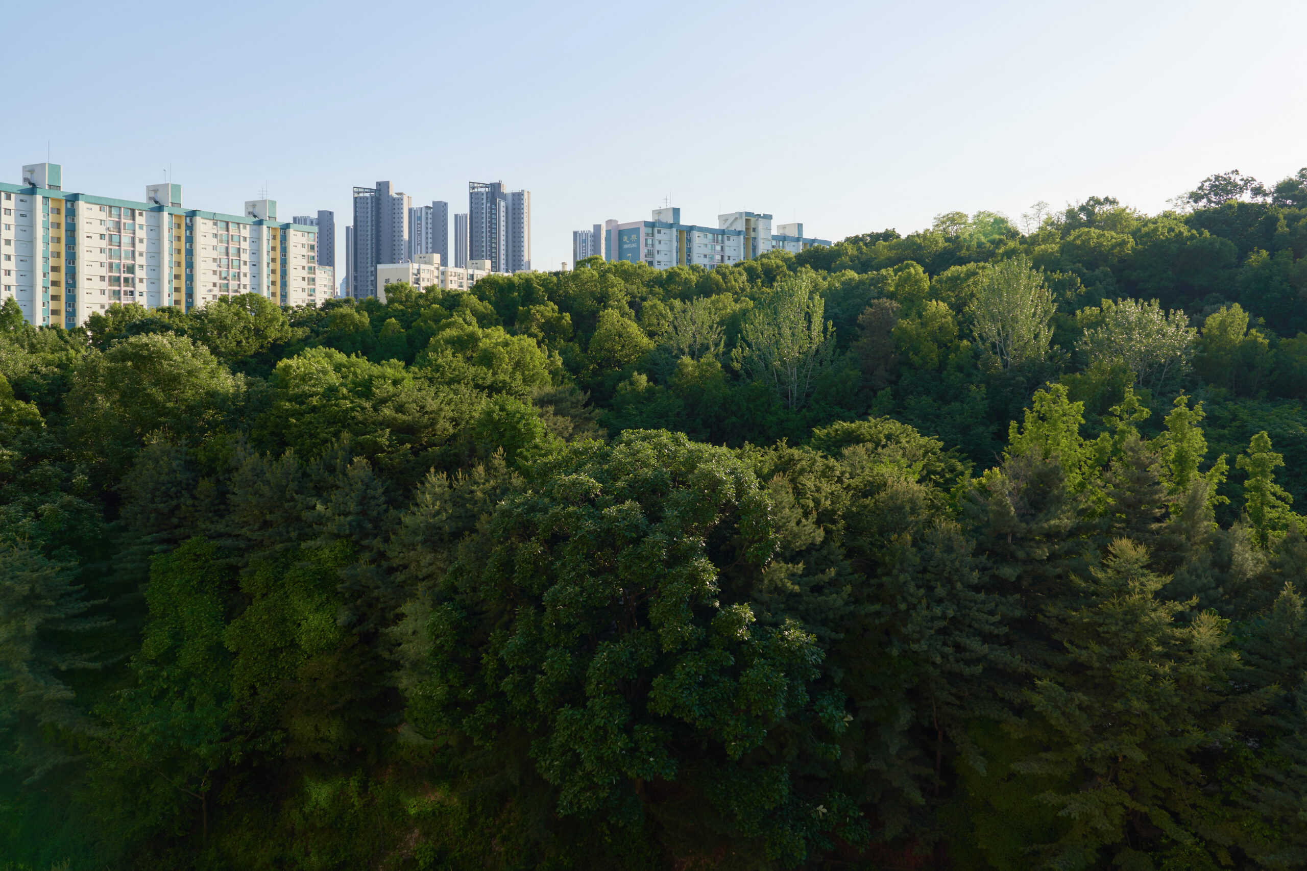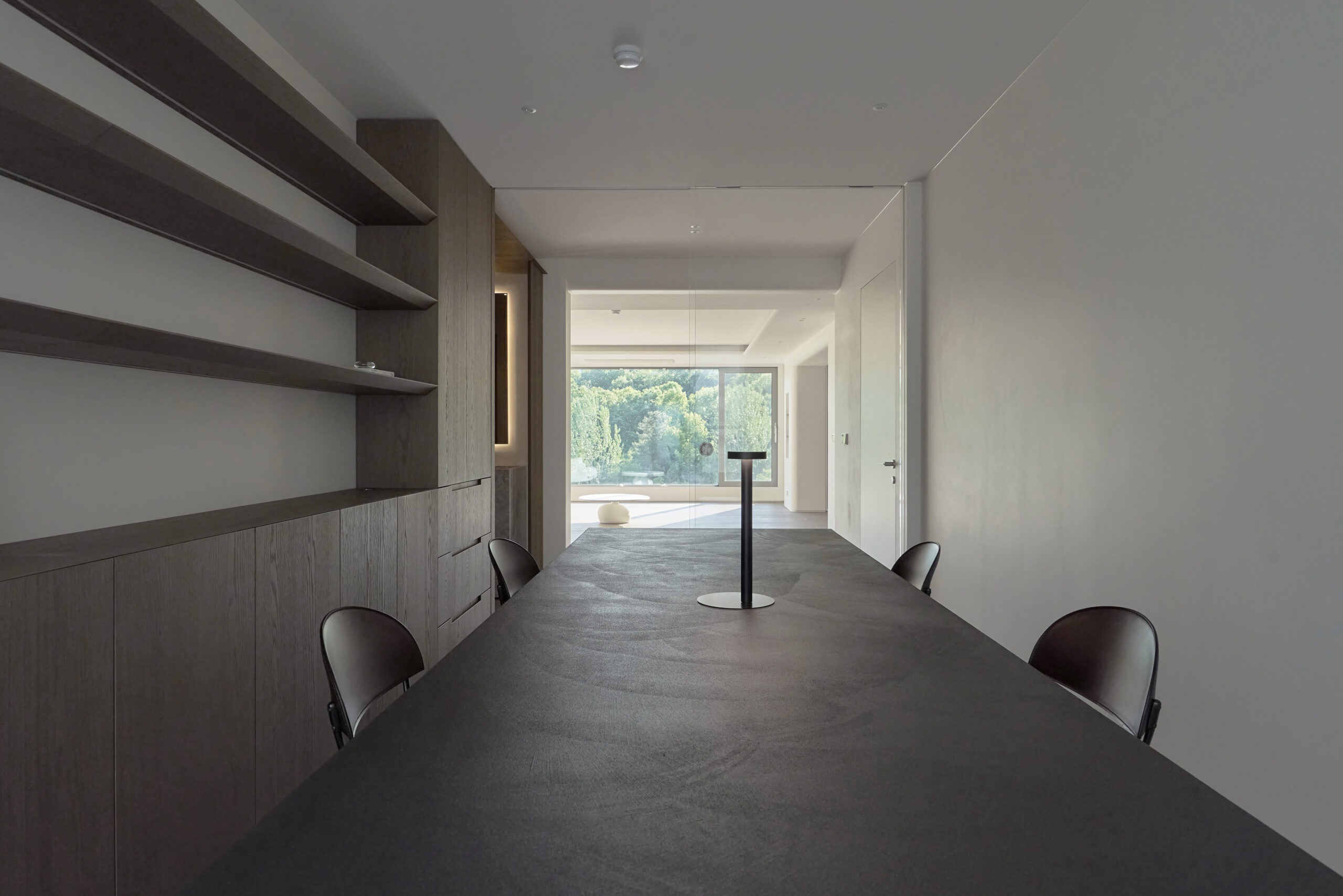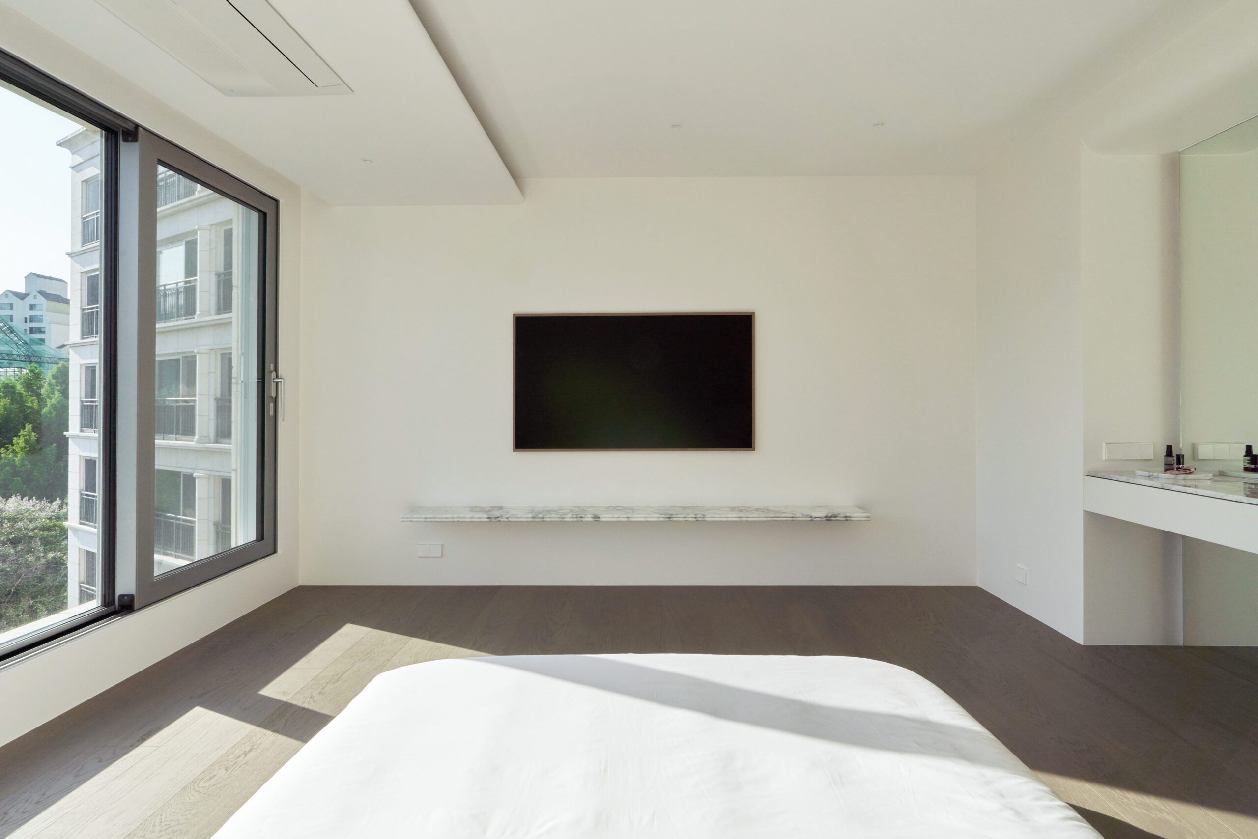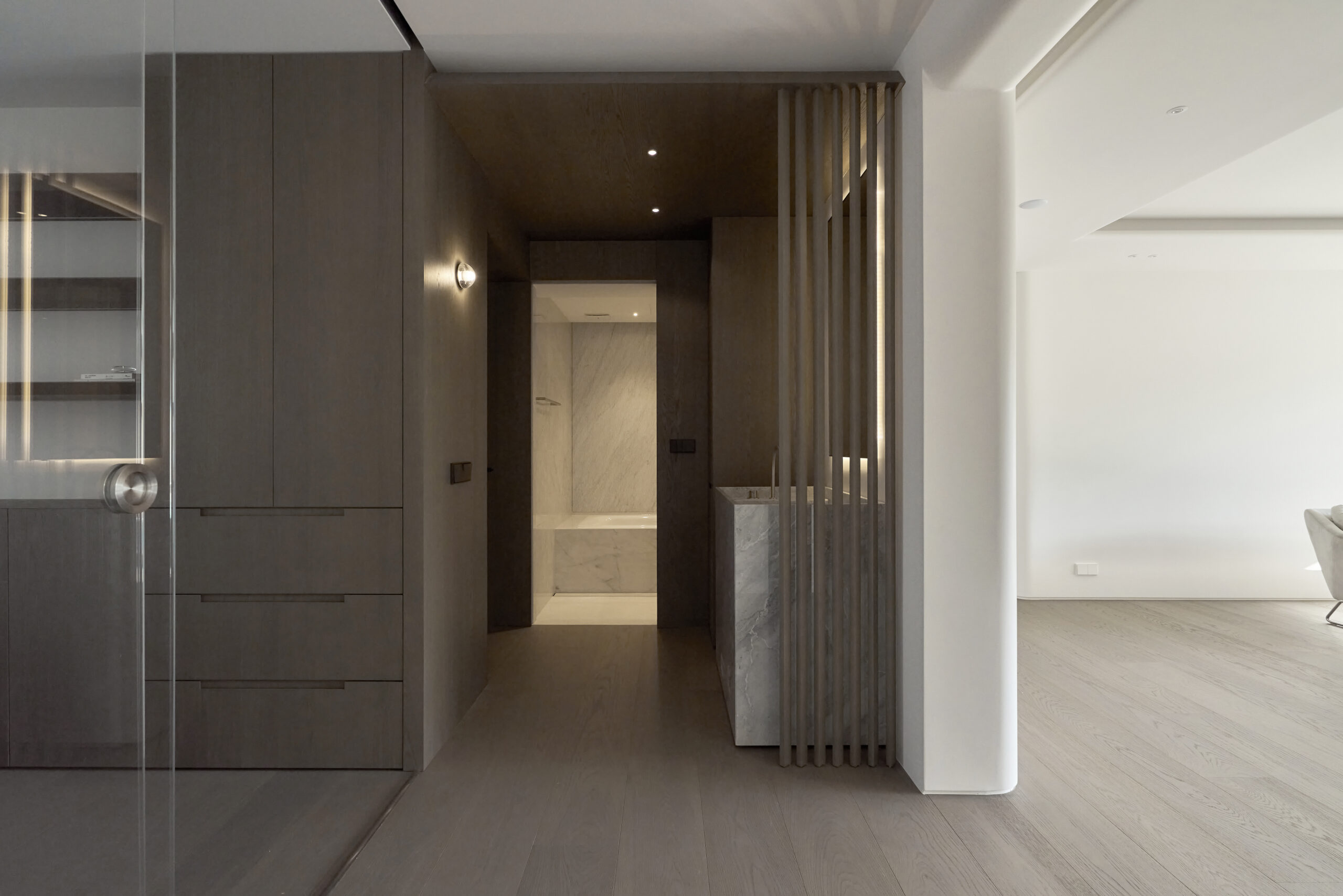 특히 거실과 안방에서 펼처지는 숲뷰와 조화를 이루기 위해 내부에도 무늬목과 원석 같은 천연 소재를 사용했습니다. 고유한 색감이 지닌 깊이를 그대로 살려 소재 자체의 아름다움이 공간 안에서 자연스럽게 존재감을 드러내도록 했습니다.
