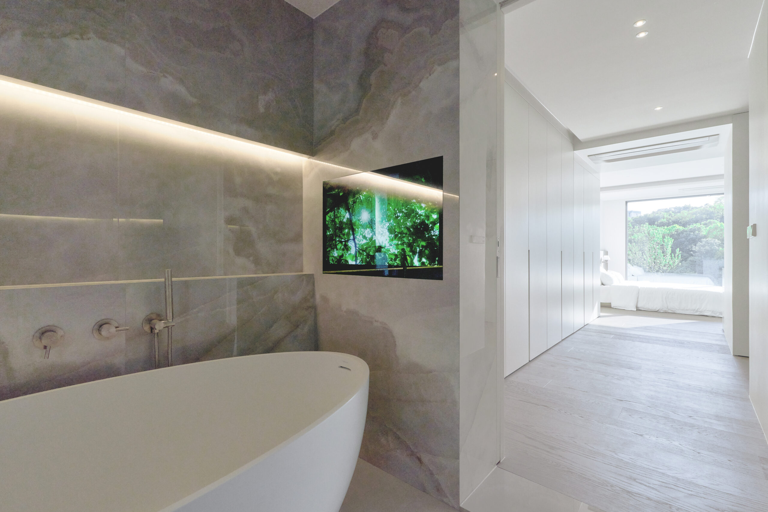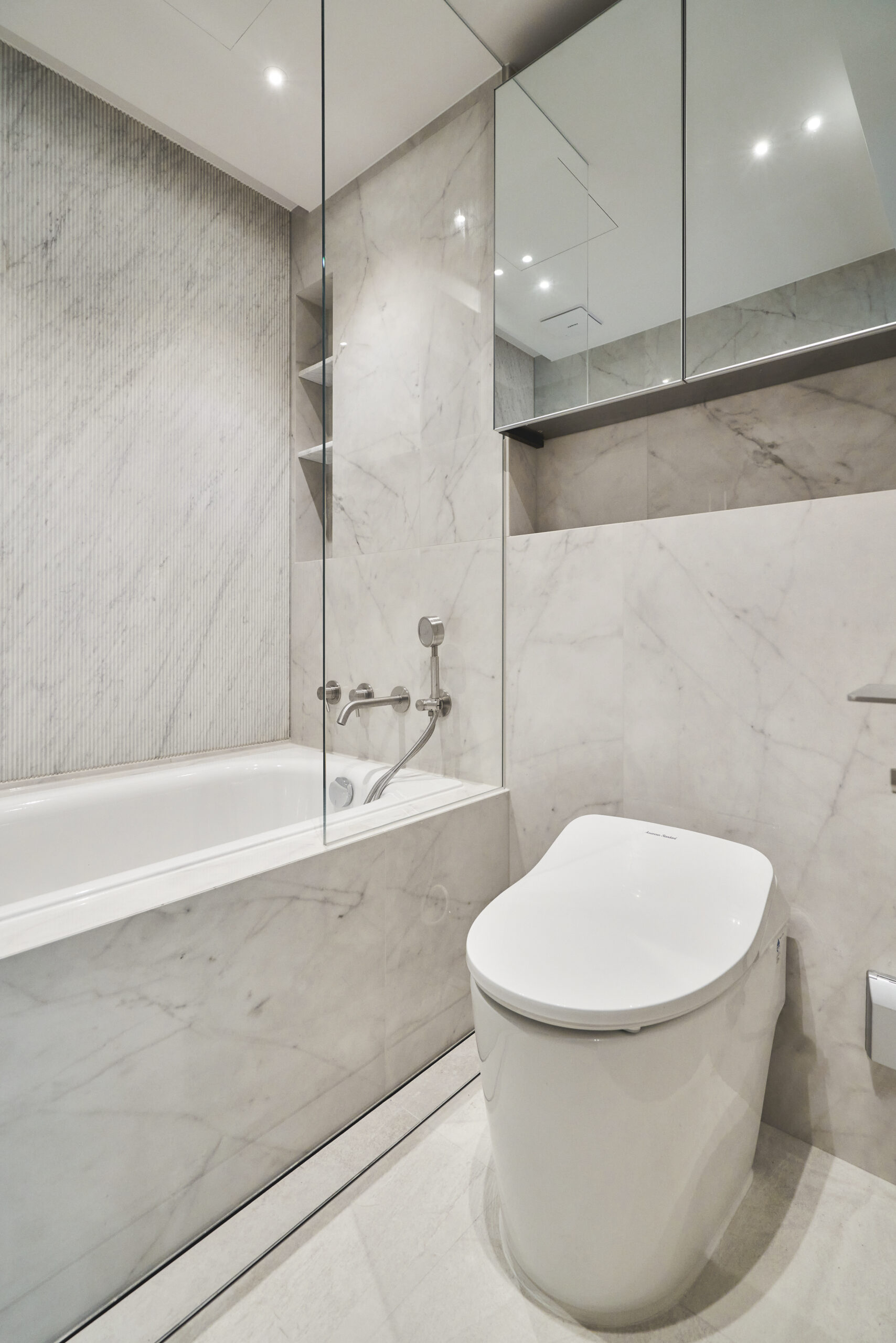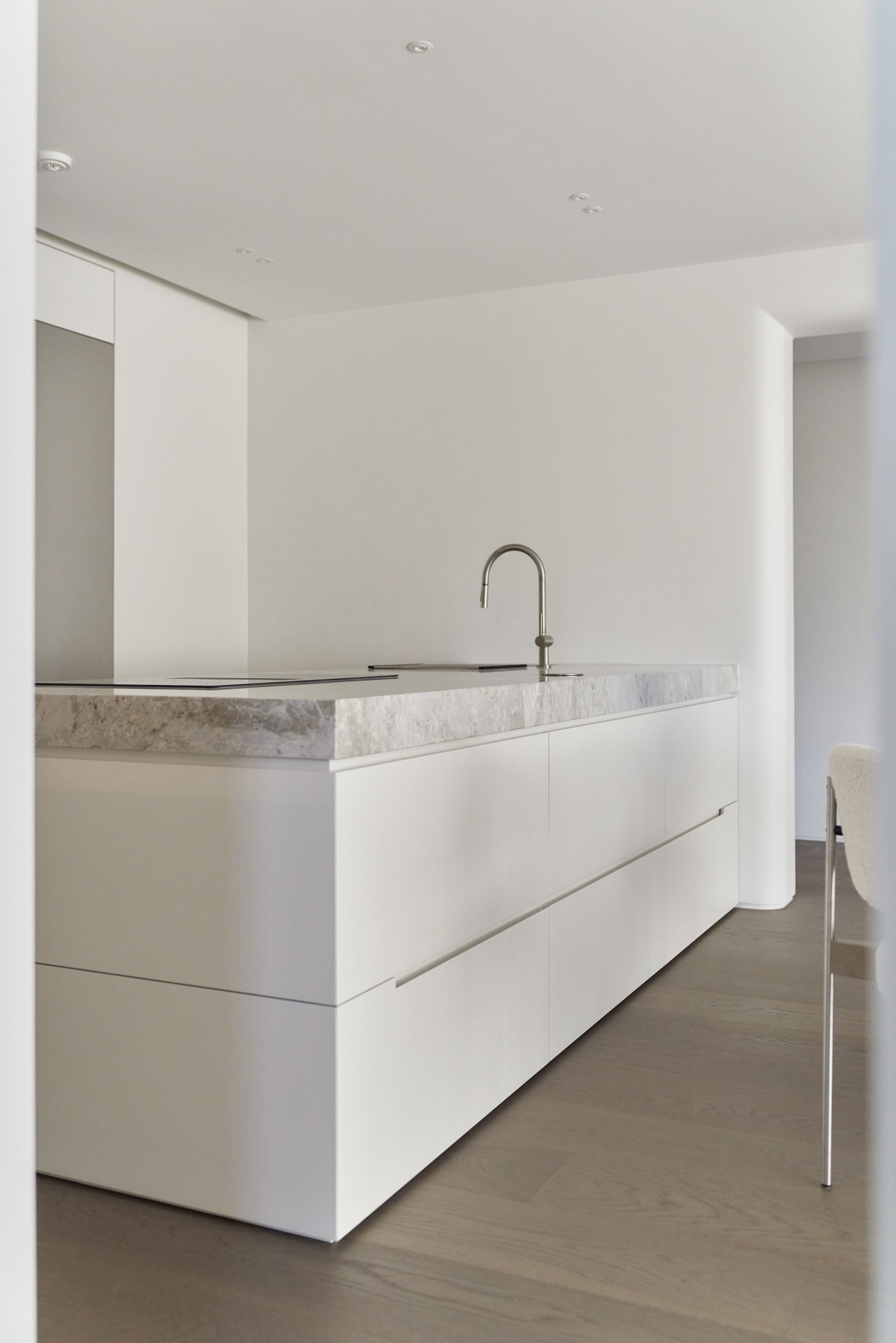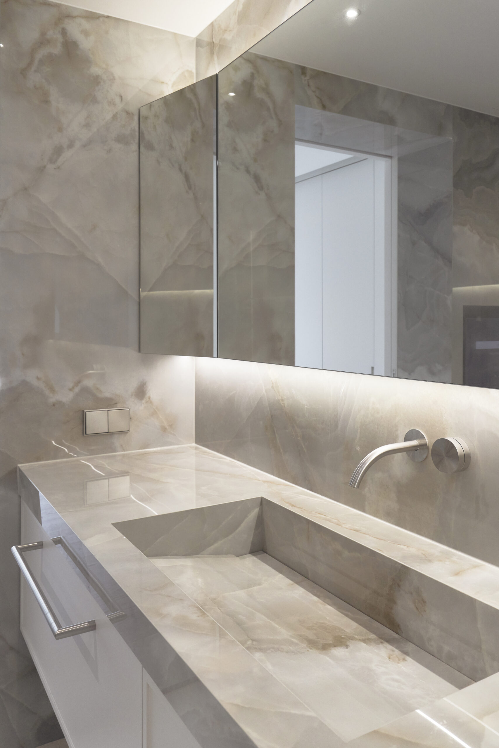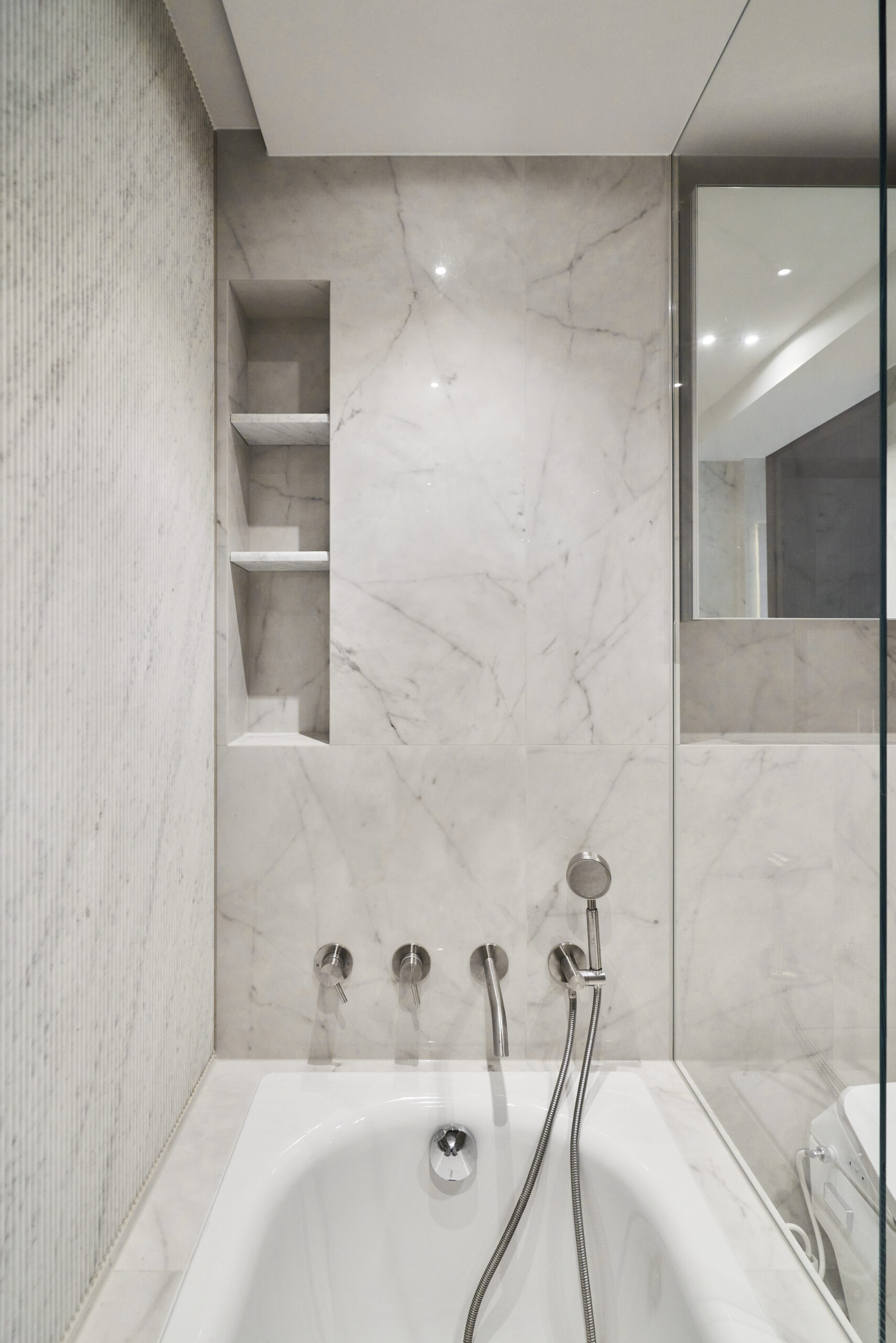 특히 거실과 안방에서 펼처지는 숲뷰와 조화를 이루기 위해 내부에도 무늬목과 원석 같은 천연 소재를 사용했습니다. 고유한 색감이 지닌 깊이를 그대로 살려 소재 자체의 아름다움이 공간 안에서 자연스럽게 존재감을 드러내도록 했습니다.