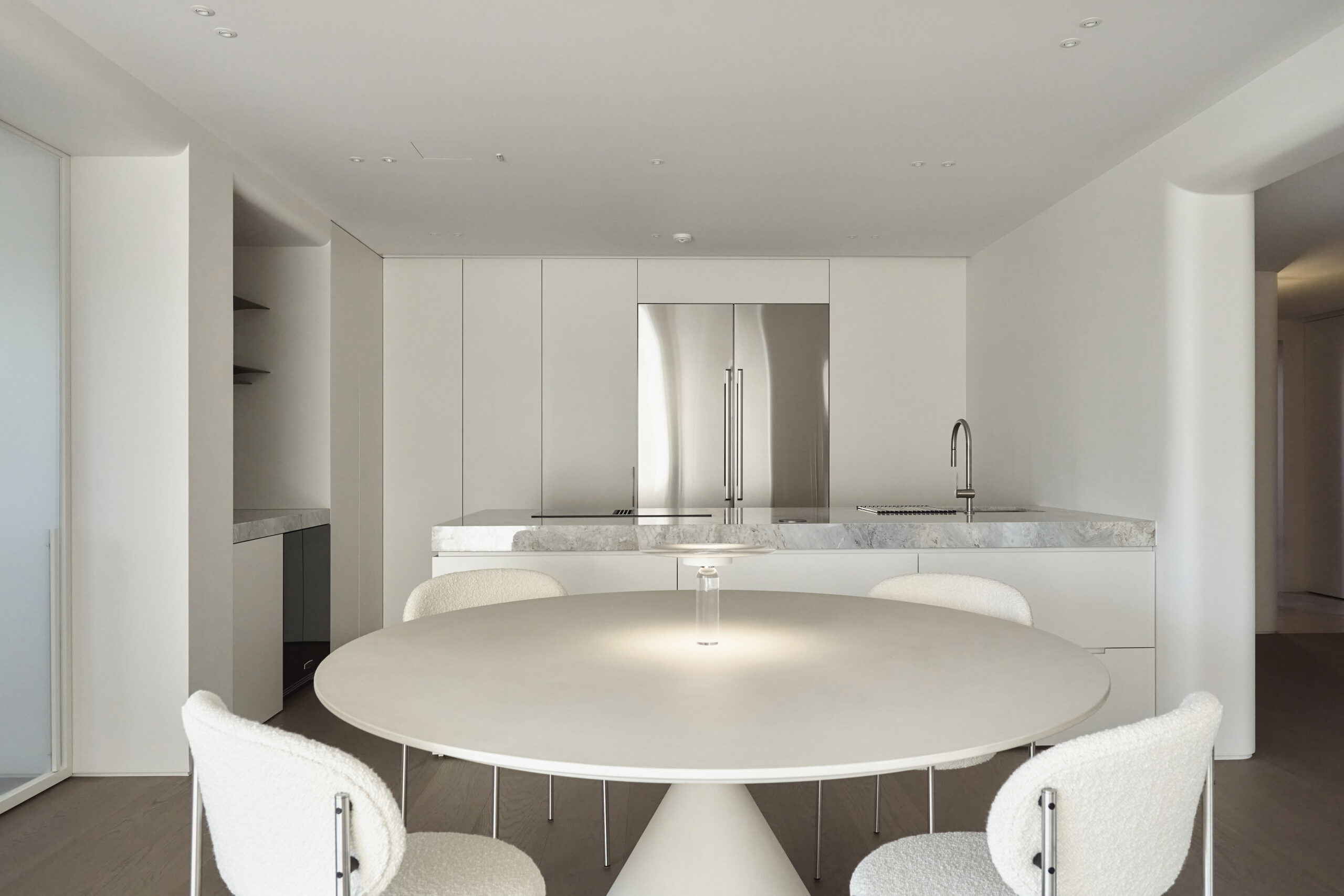 The space is defined by calm materials and a family-centered layout, using washed walnut flooring, soft finishes, and natural materials to harmonize with the forest view. Thoughtful zoning and integrated storage create a relaxed flow and a unified, serene living environment.