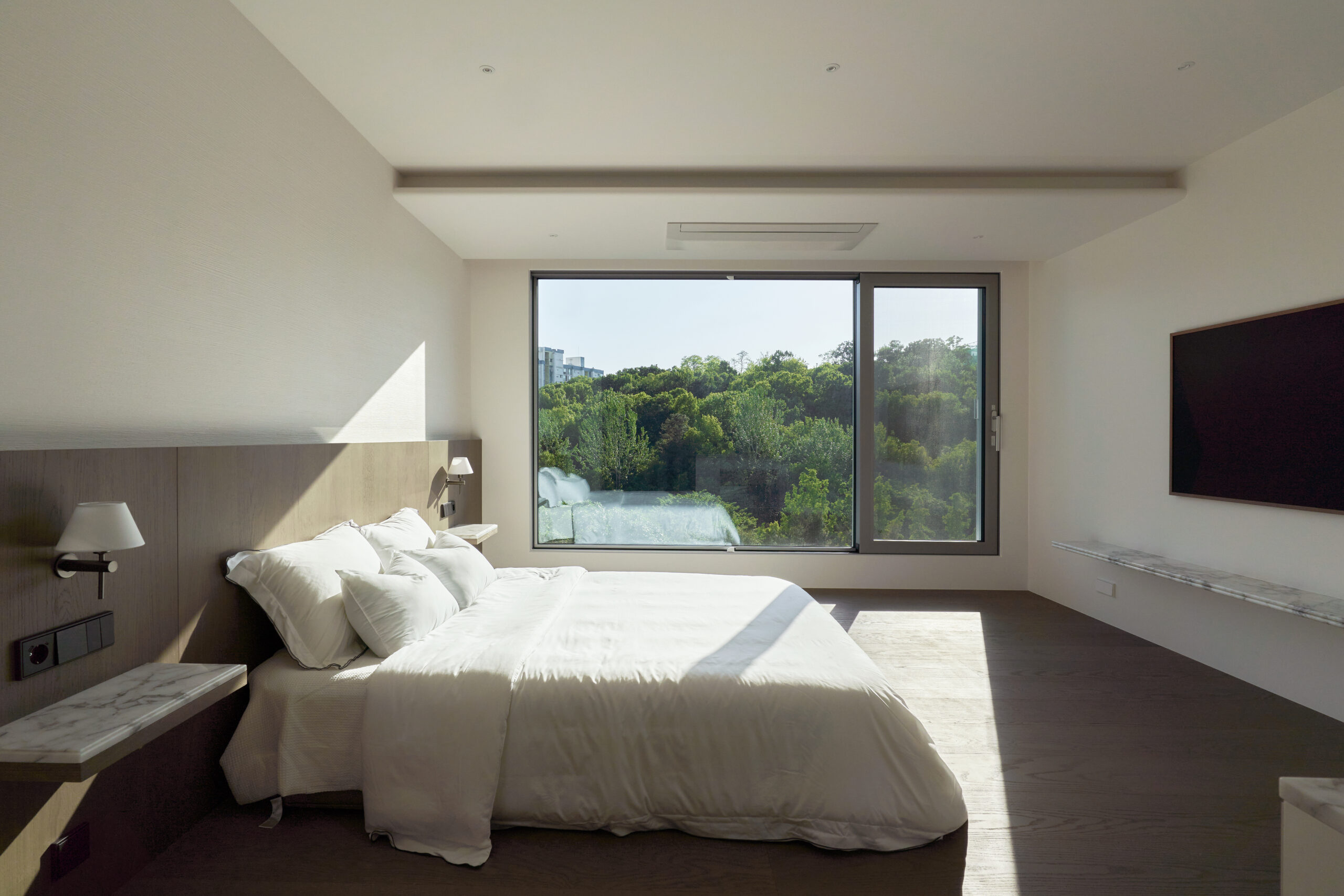 창의 컬러는 밤보다 낮에 차경이 더 아름다운 거주환경에 맞게 실버 컬러를 배치하여 낮에 창 프레임과 숲의 뷰가 한 덩어리로 보여질 수 있도록 했습니다.