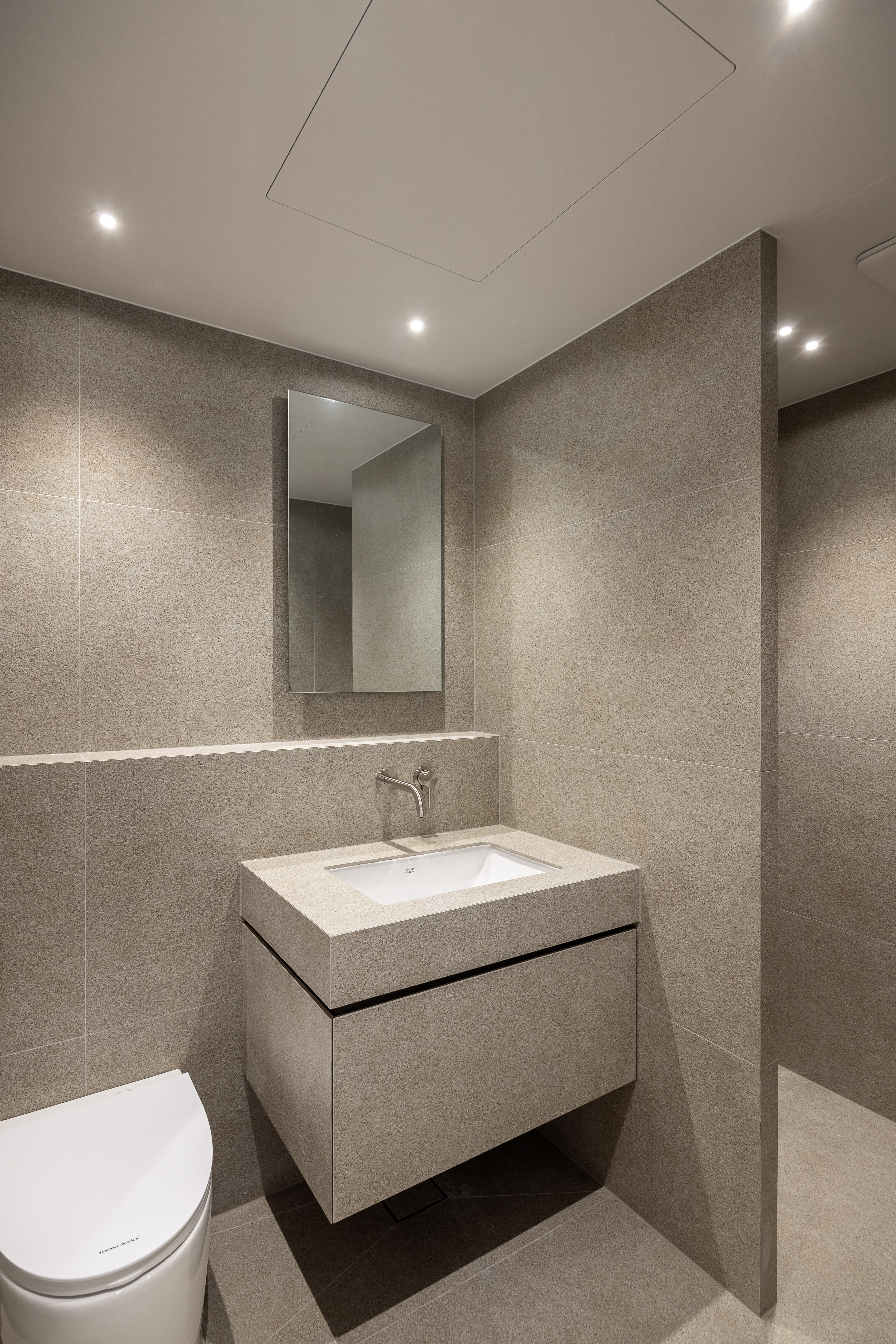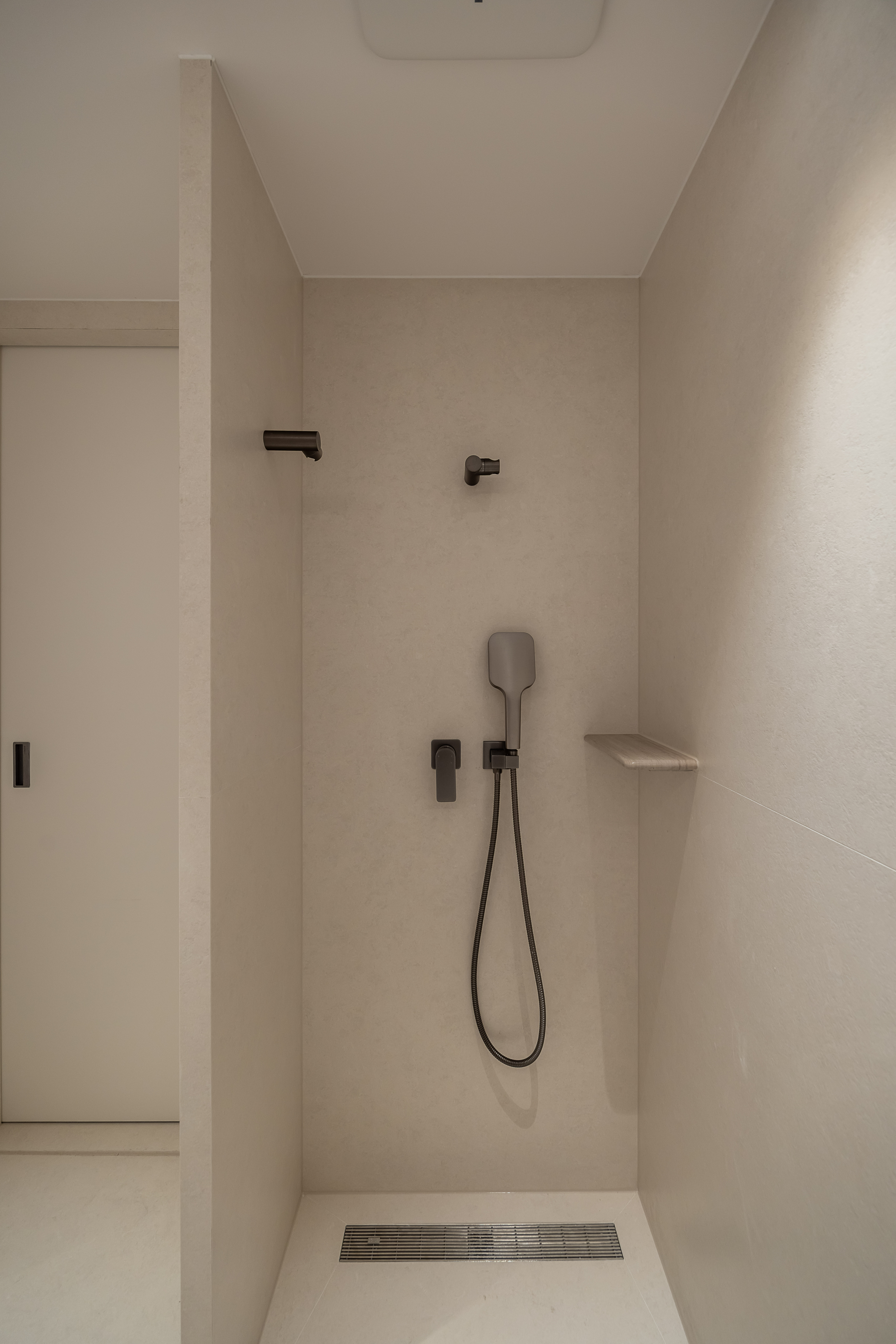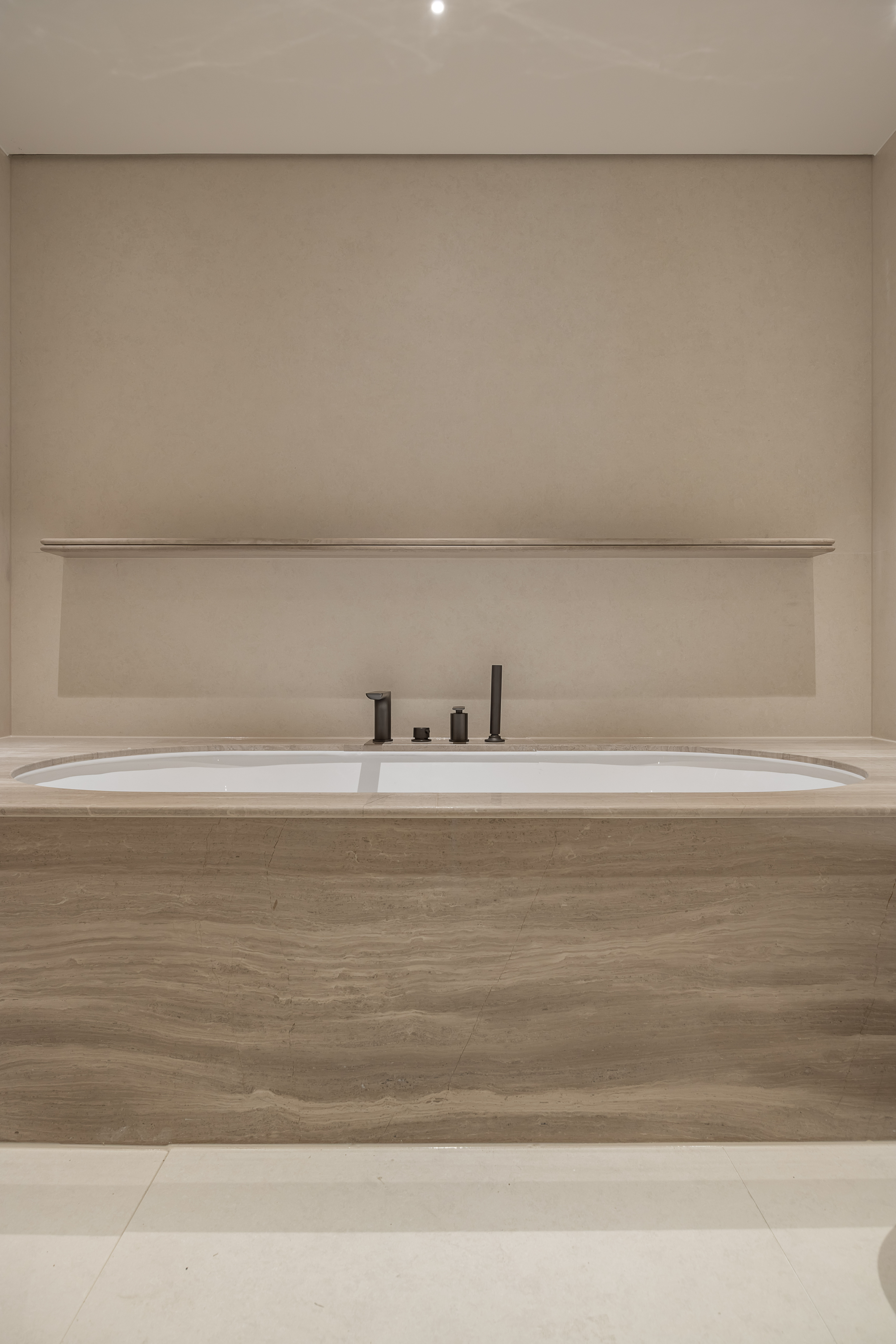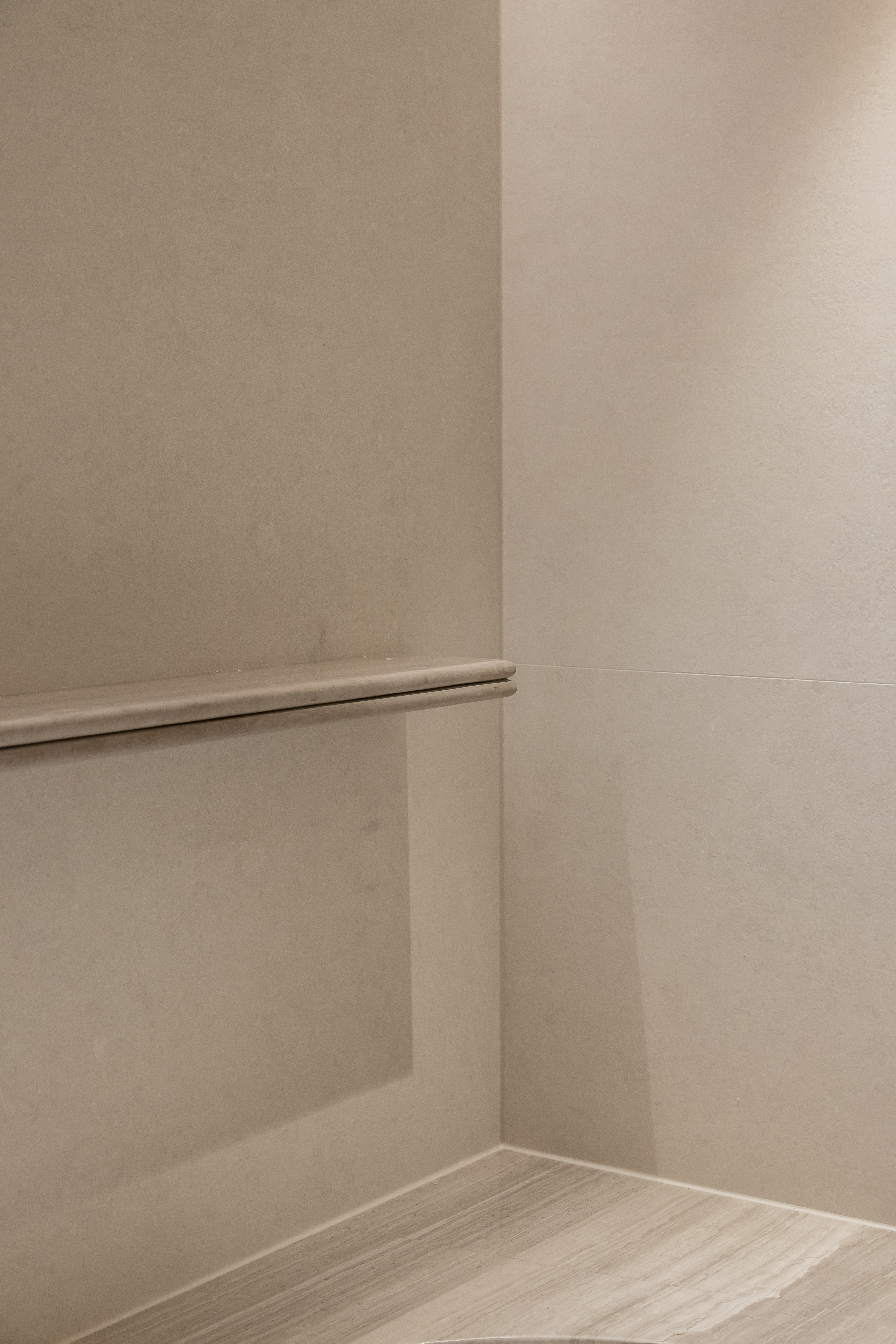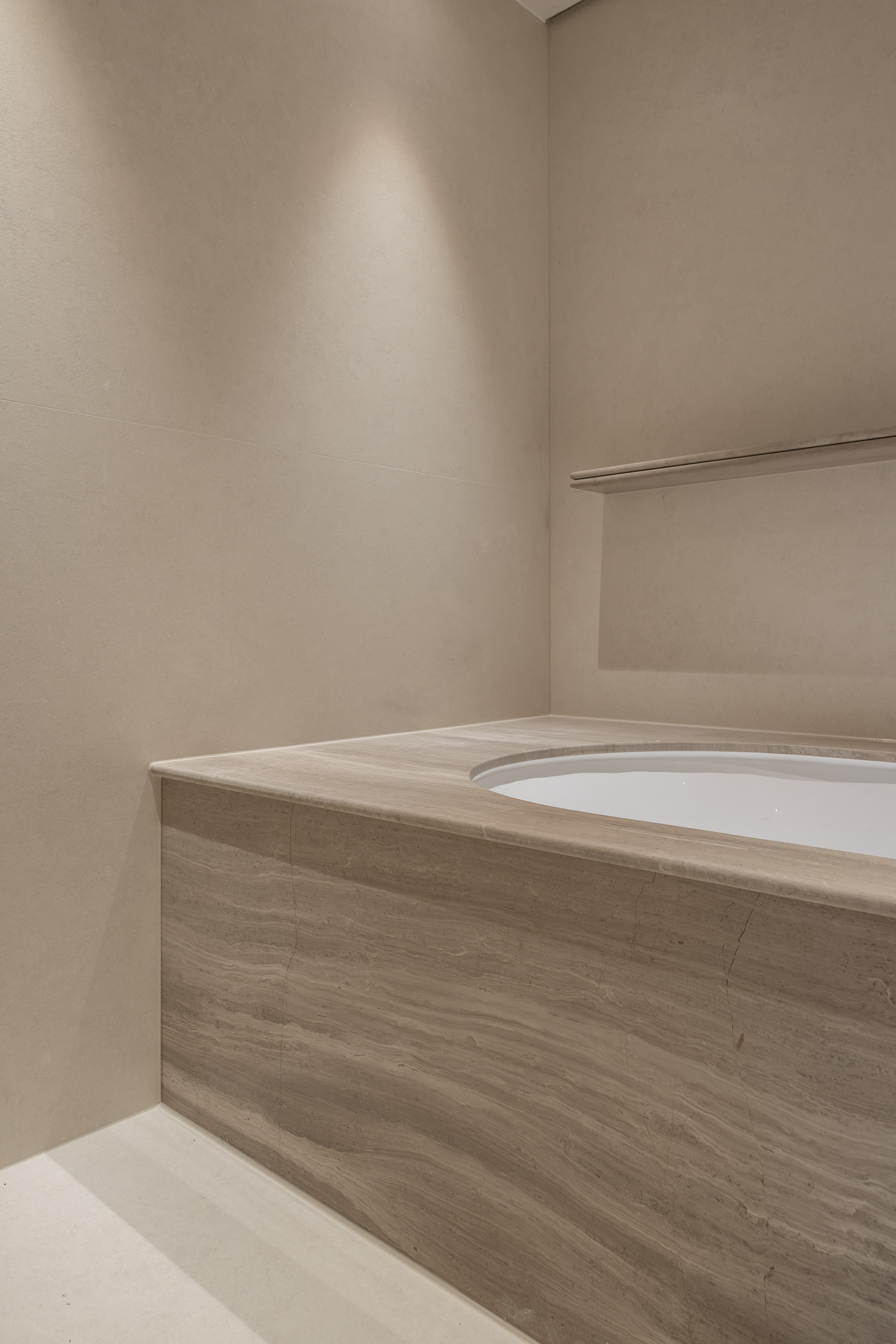 안방에 위치한 욕실은 전면부에 대형 욕조를 배치하여 여유가 느껴지는 새로운 레이아웃으로 완성했습니다. 넓지 않은 공간이지만 여백의 미를 주기 위해 타일은 깨끗한 박판타일 그리고 살이 닿는 선반과 욕조 프레임은 원석을 둥글게 가공하여 아름답지만 사용하기에도 편안하게 소재를 적용했습니다.
