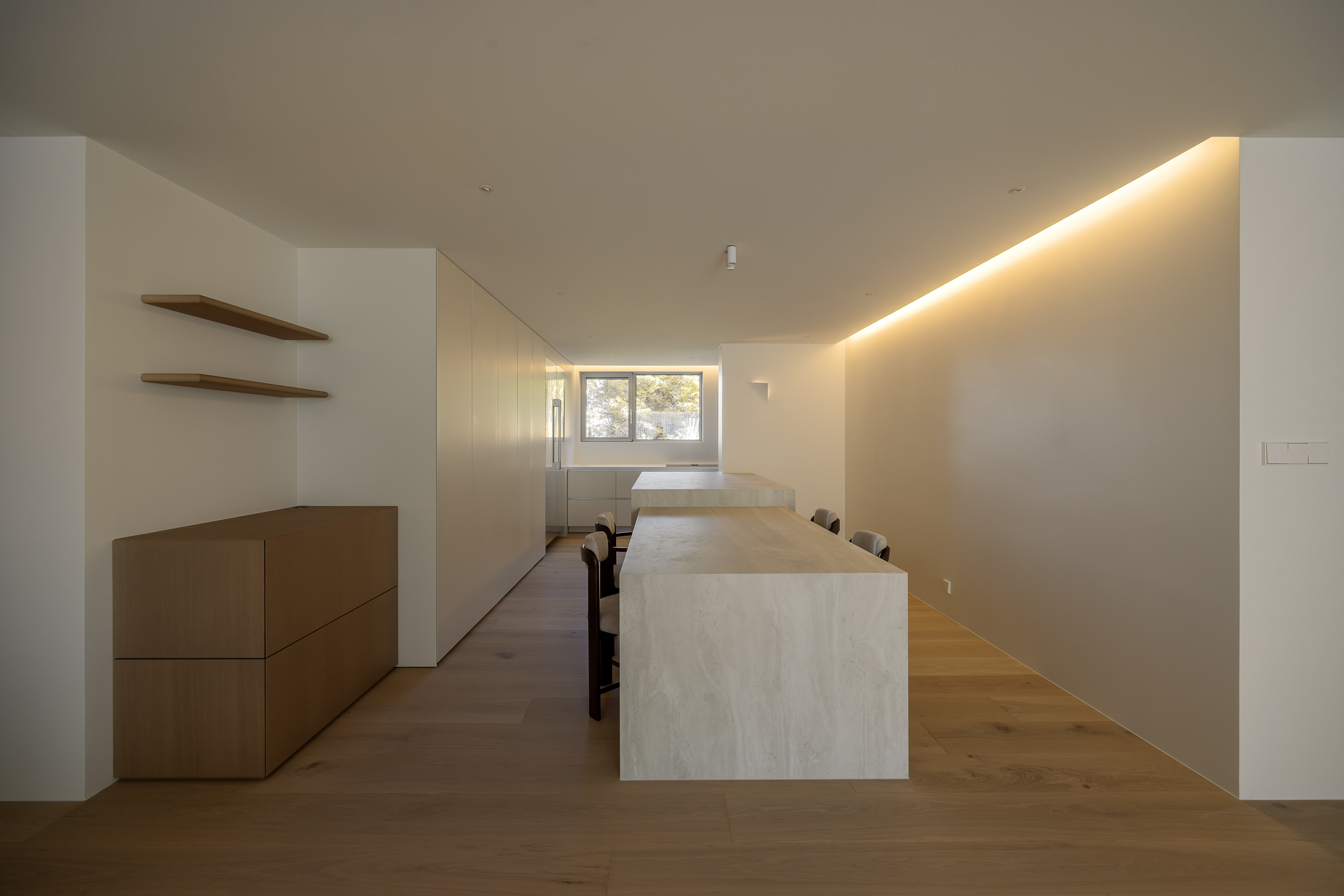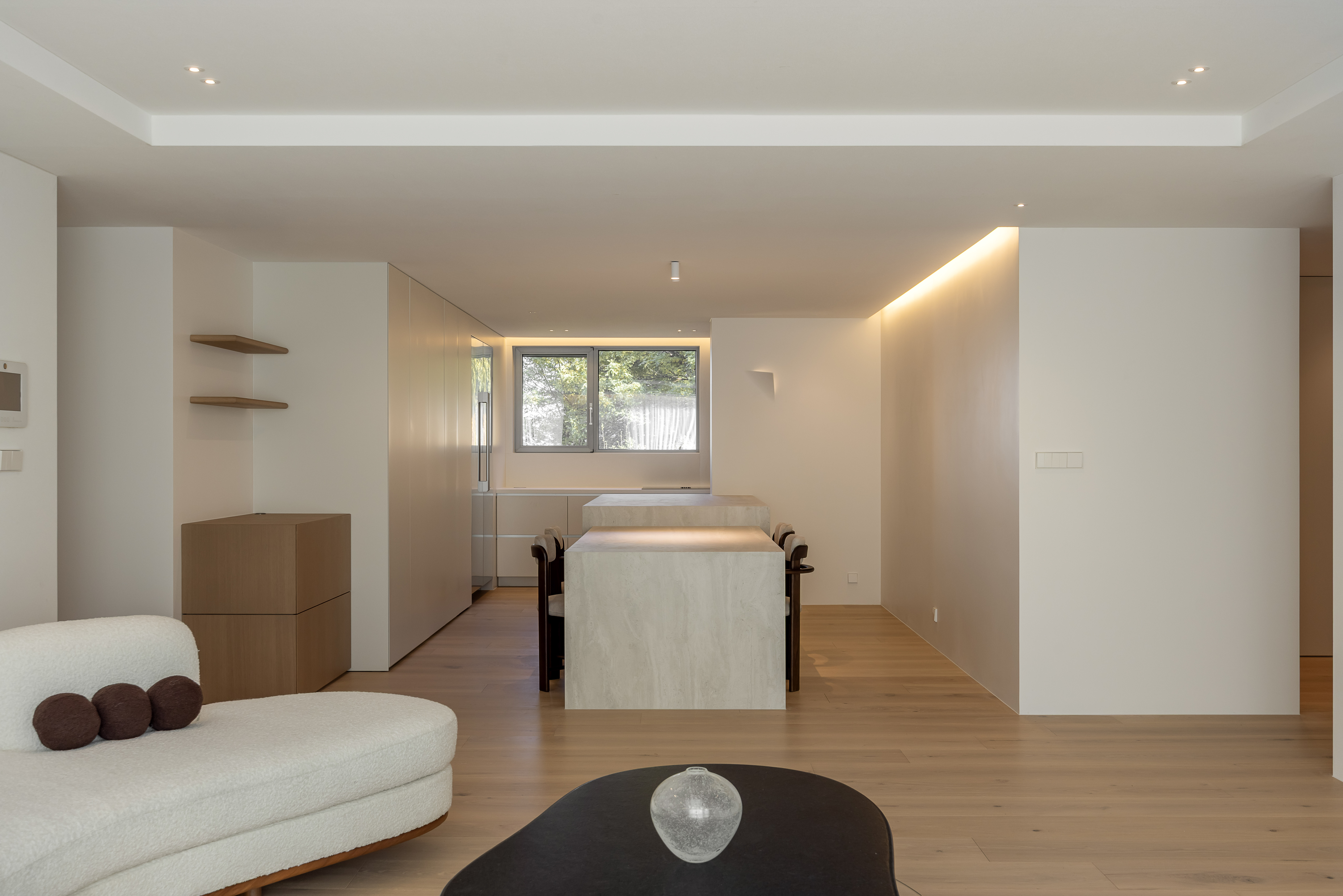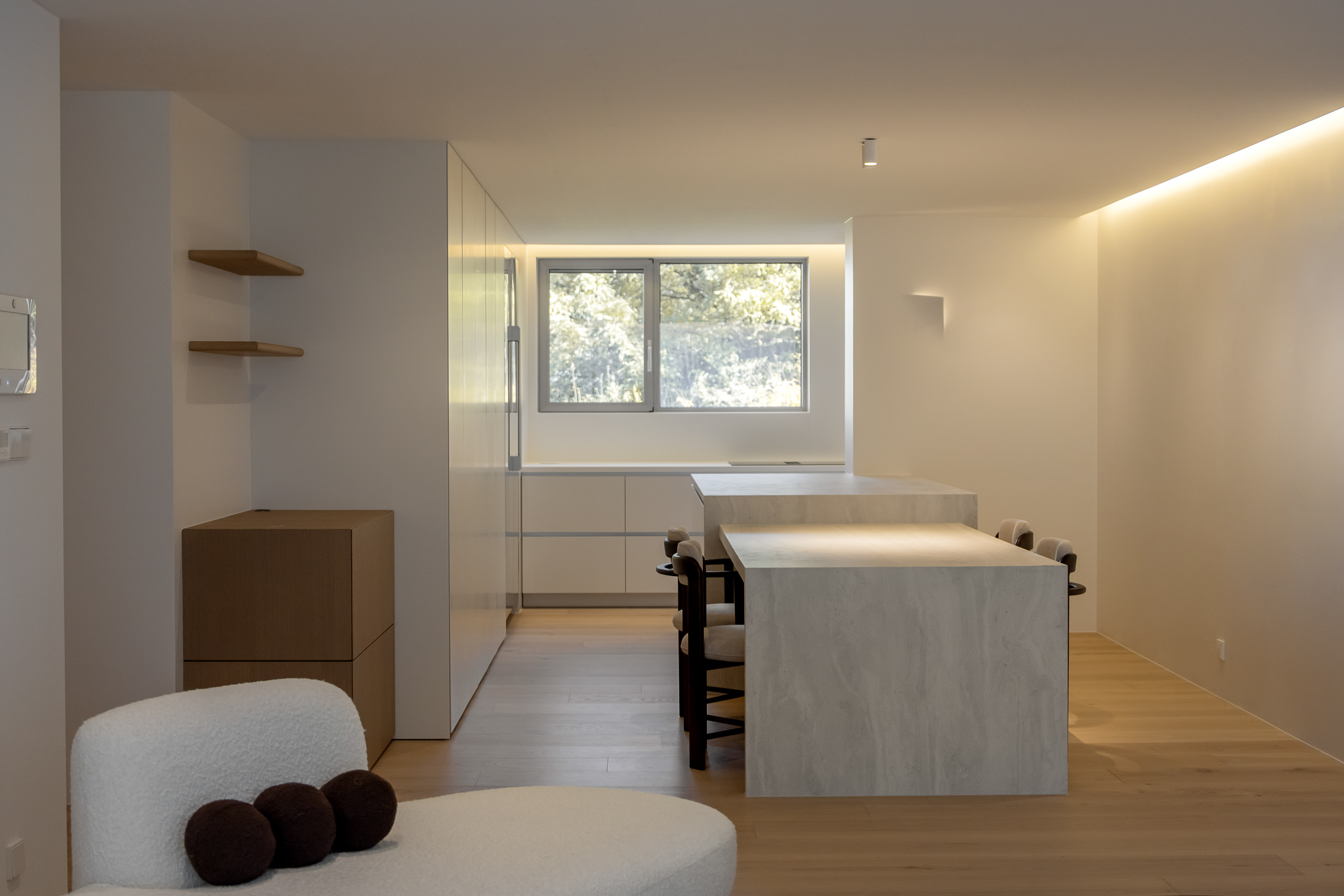 Focusing on a calm atmosphere and practical storage, this project improves spatial flow by integrating the laundry area into the kitchen to capture the forest view and maximizing storage with a large island. By restructuring the master suite to create a 'wind path' for ventilation and using premium materials like large-format tiles and rounded natural stone, we transformed a cramped layout into a serene, functional home that balances efficiency with the beauty of emptiness