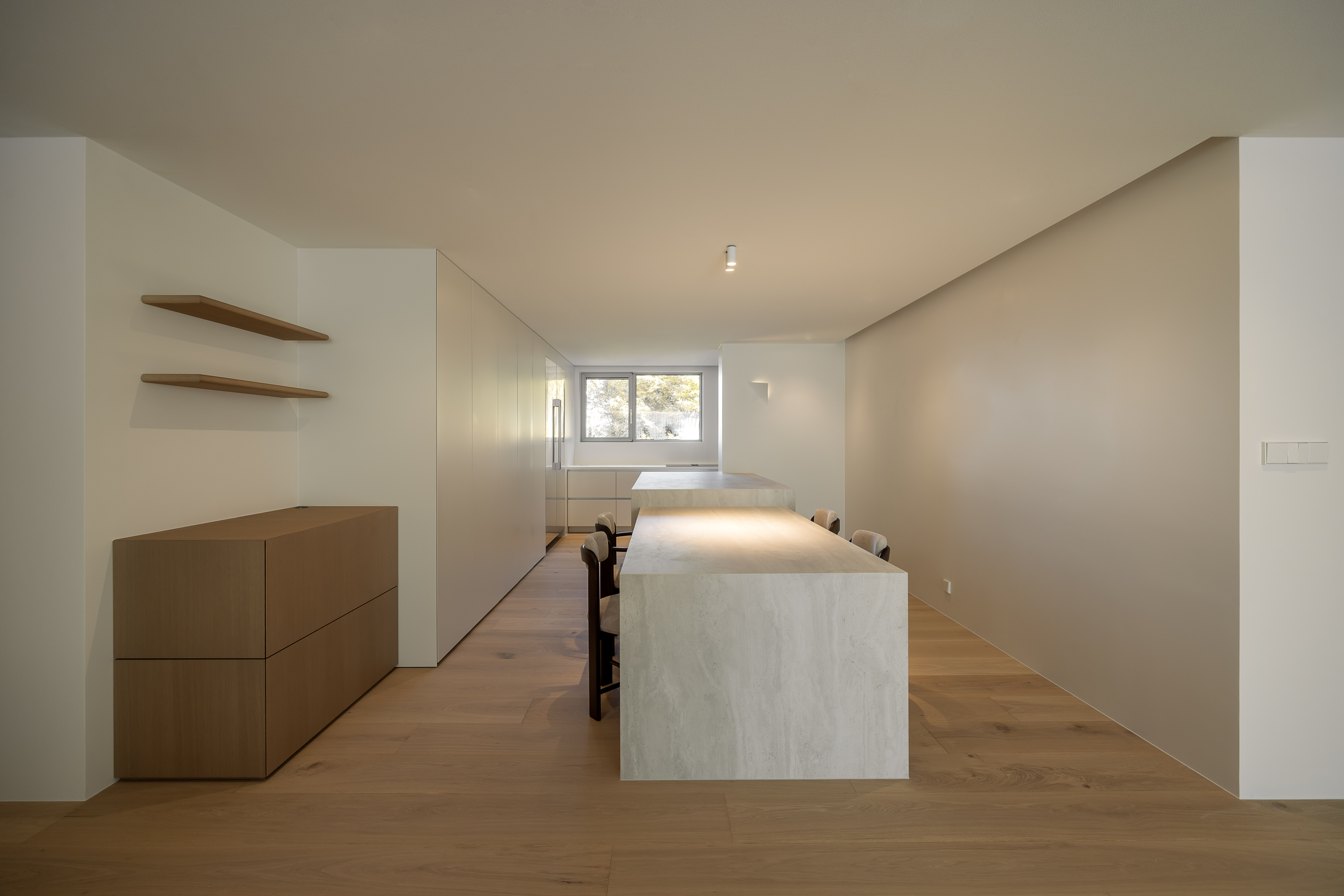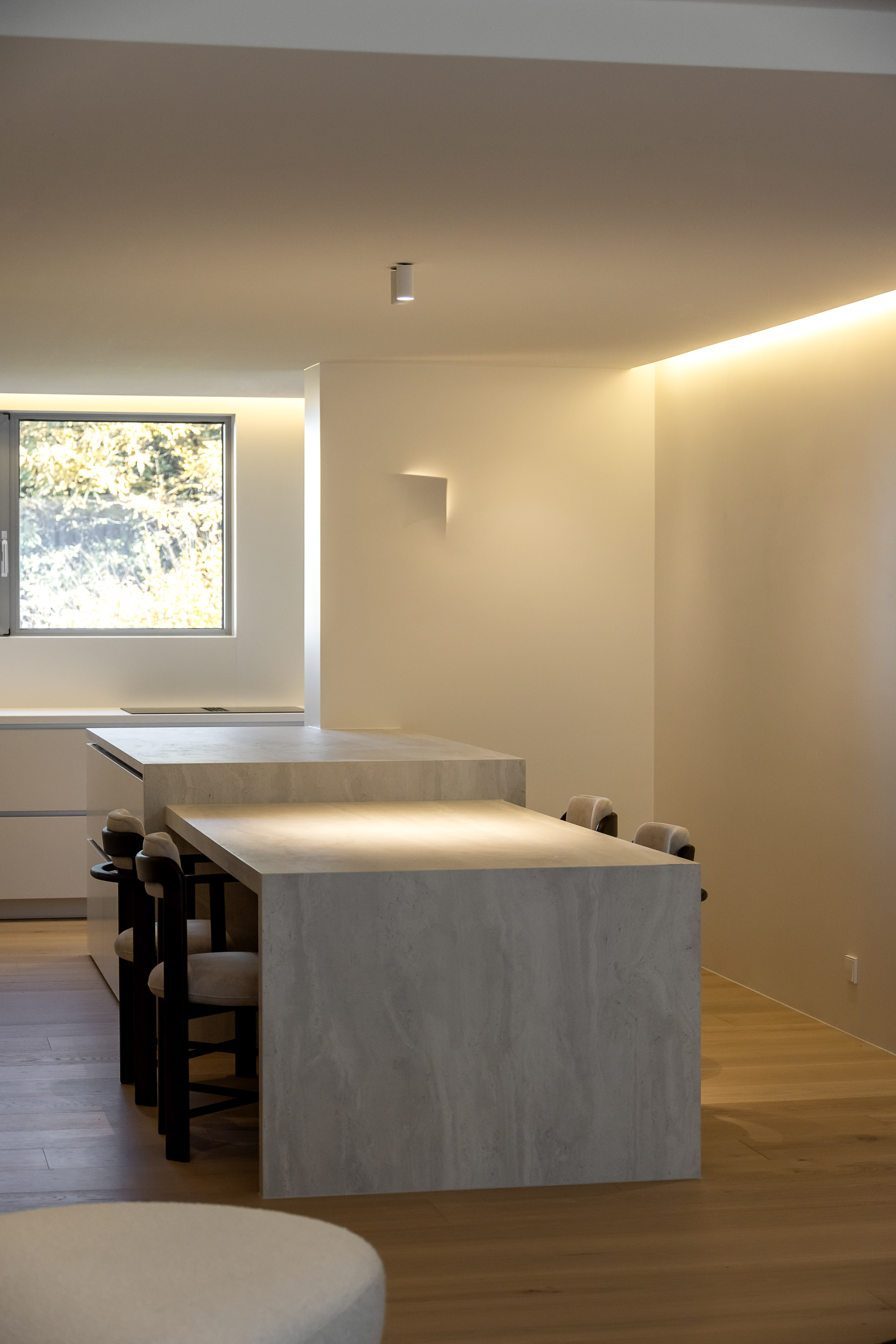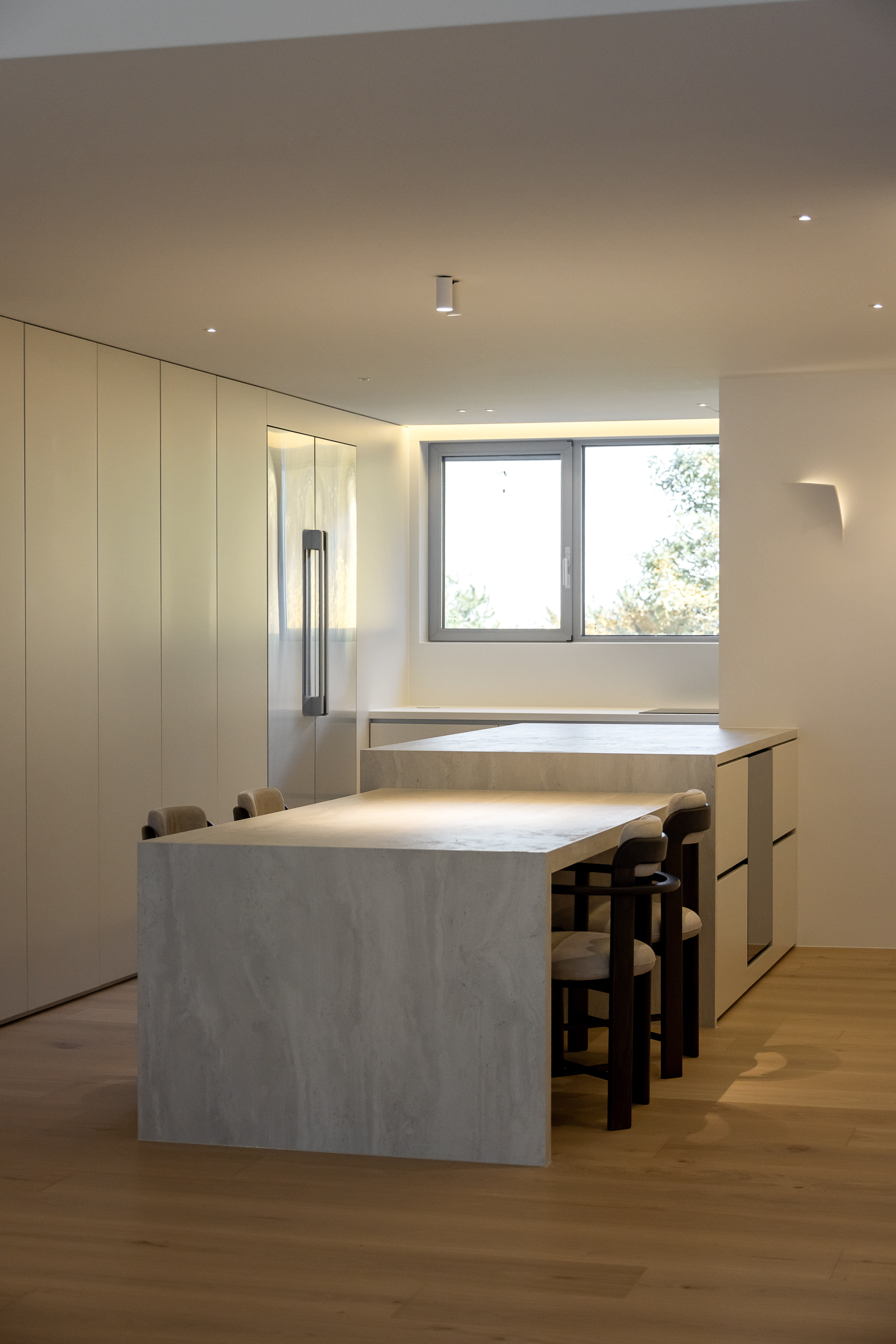 Focusing on a calm atmosphere and practical storage, this project improves spatial flow by integrating the laundry area into the kitchen to capture the forest view and maximizing storage with a large island. By restructuring the master suite to create a 'wind path' for ventilation and using premium materials like large-format tiles and rounded natural stone, we transformed a cramped layout into a serene, functional home that balances efficiency with the beauty of emptiness