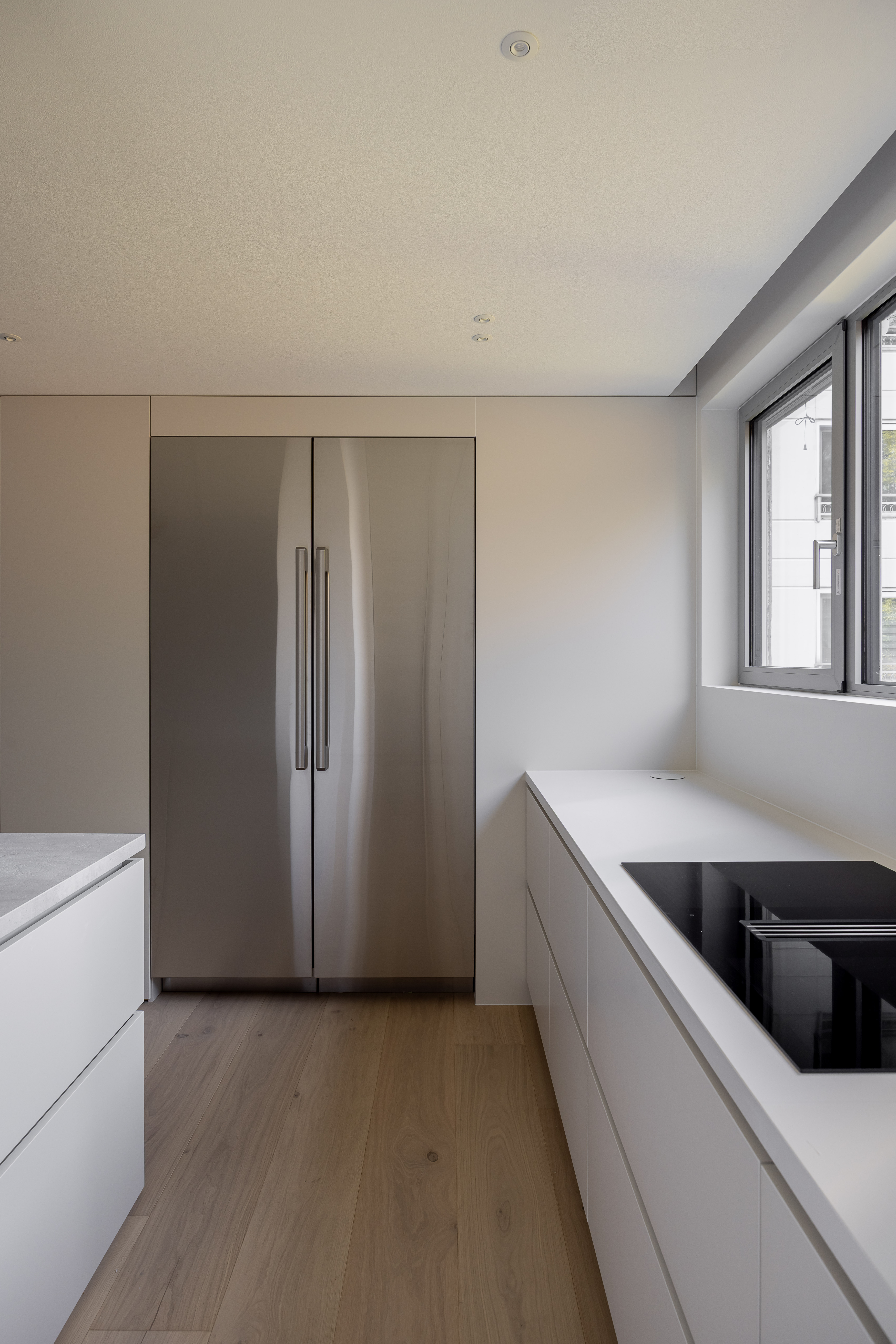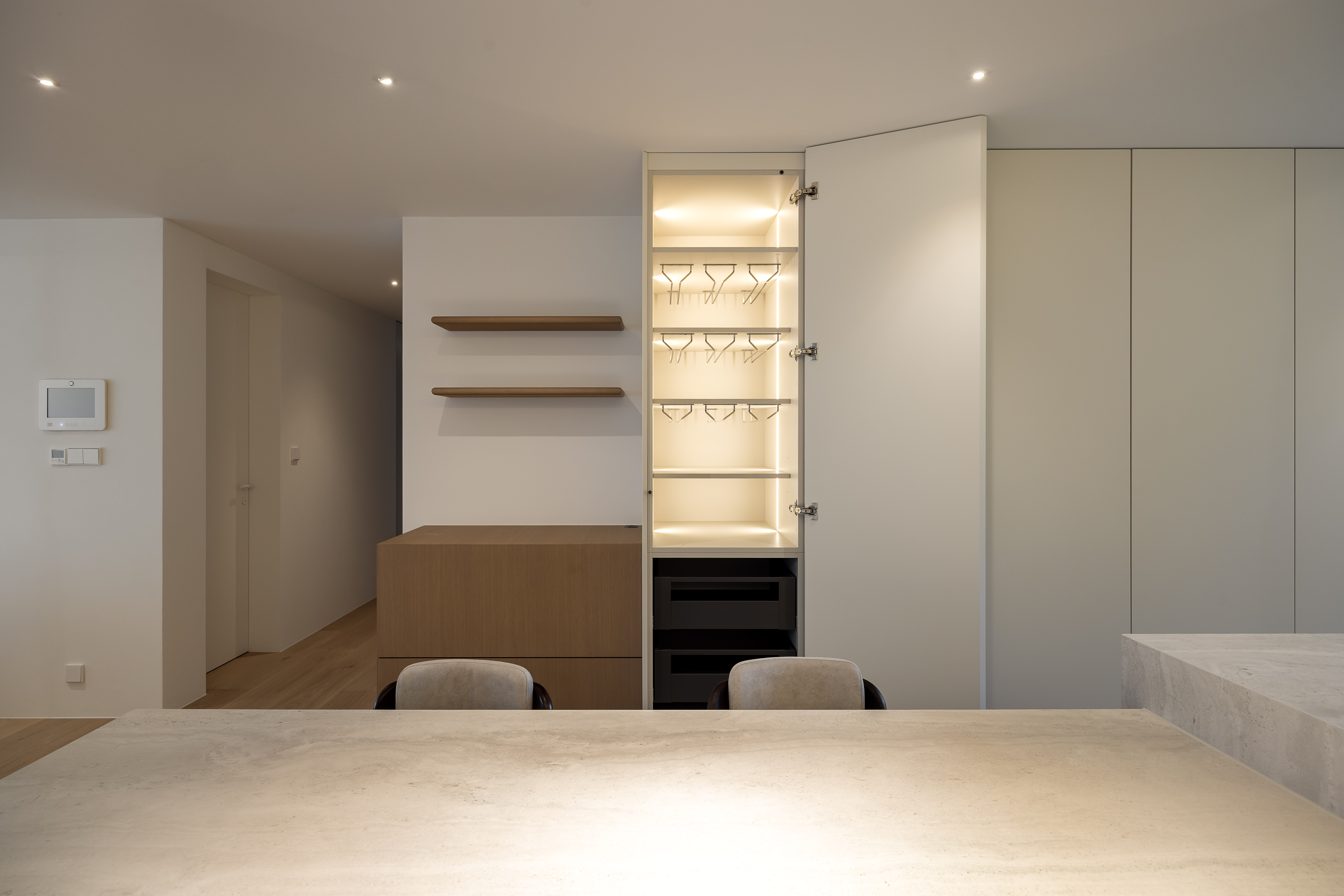 기존 세탁실 공간으로 쓰이던 발코니을 주방으로 변경하여 일부 키큰장 속으로 세탁기 기능을 컴팩트하게 담았습니다. 습식 발코니가 없어진 대신 많은 수납과 편리한 동선을 얻을 수 있었습니다.