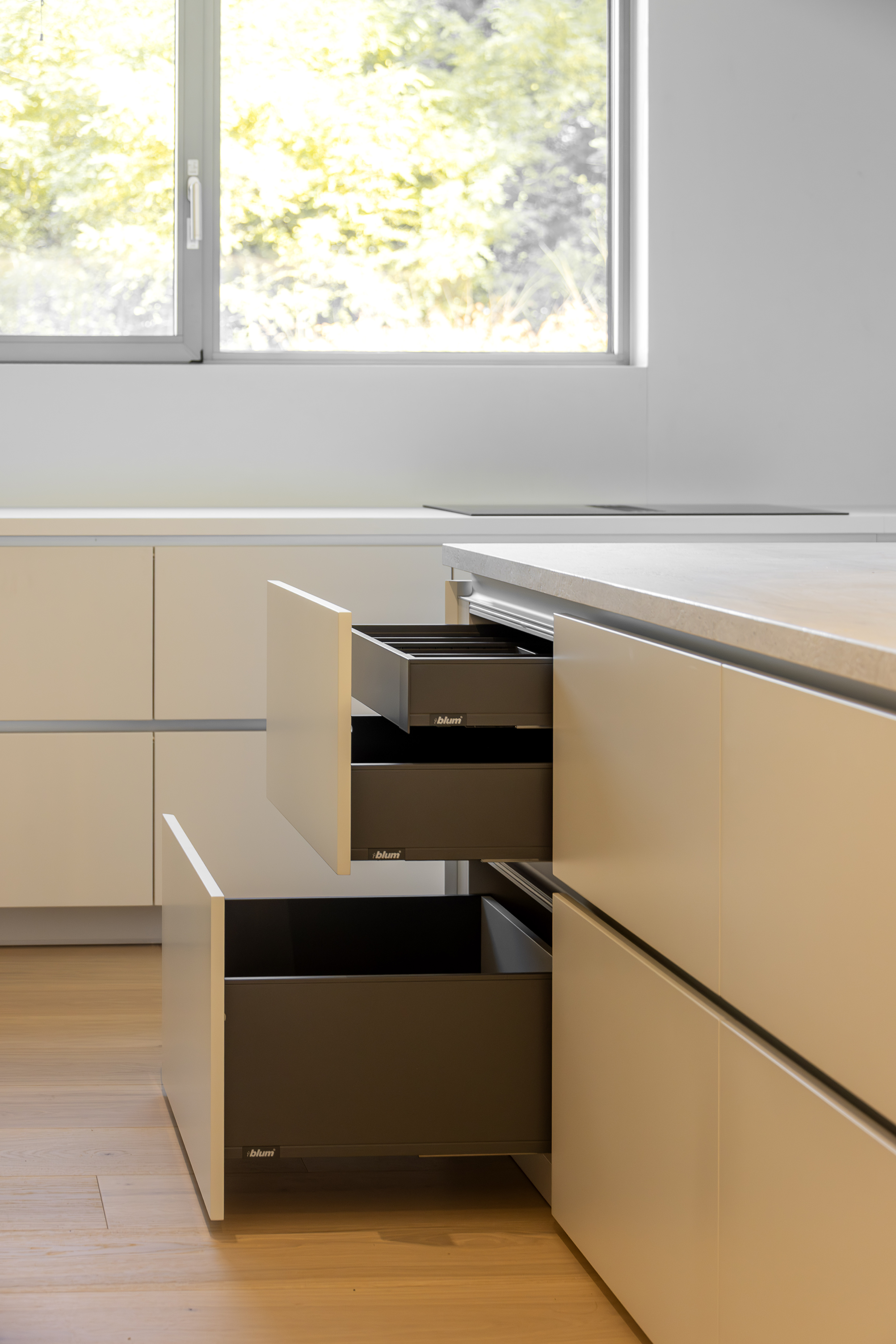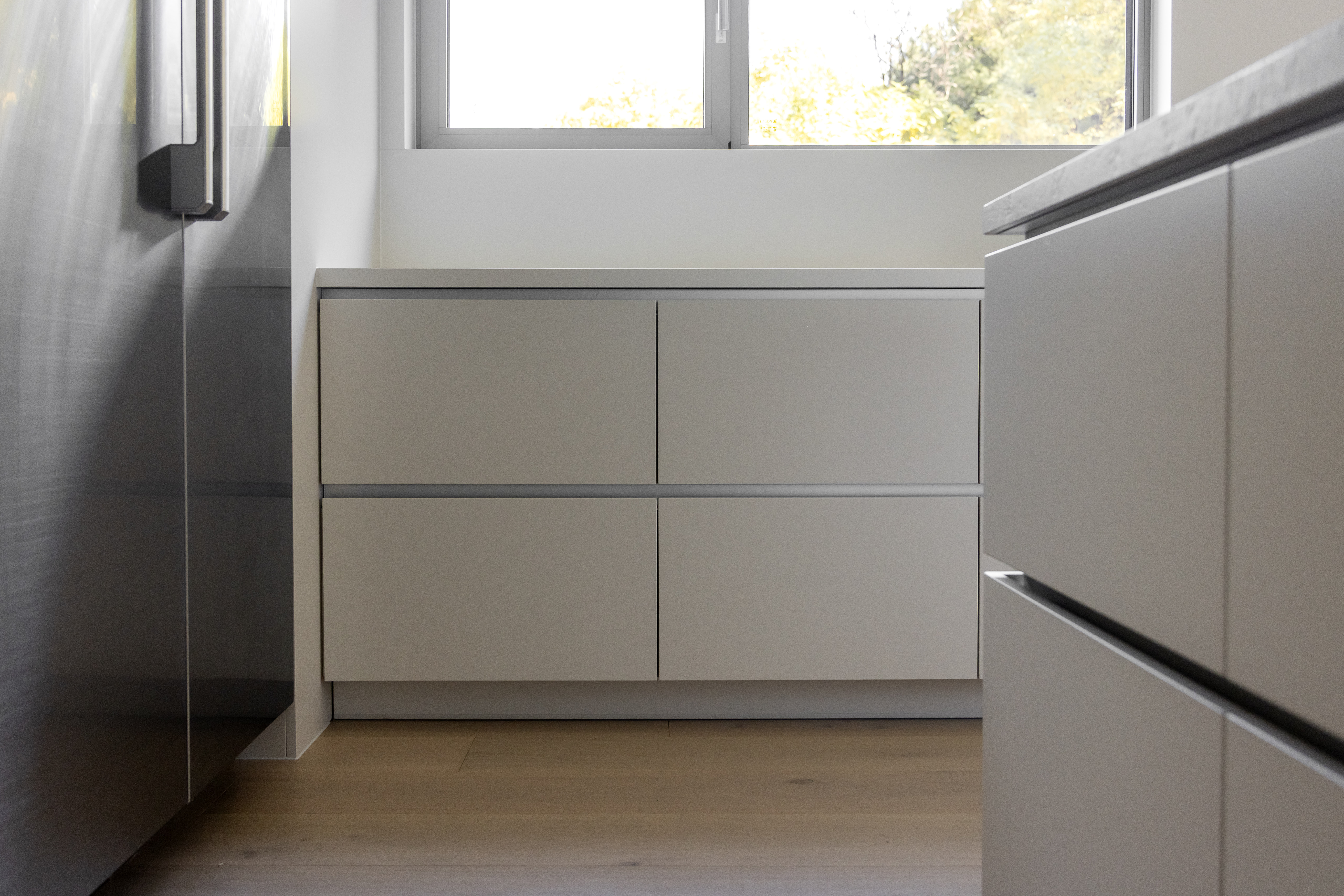 다만 가장 끝부분은 키큰장이 아닌 하부서랍과 선반을 활용하여 주방이 가로로 넓게 시야에 들어올 수 있도록 했습니다.